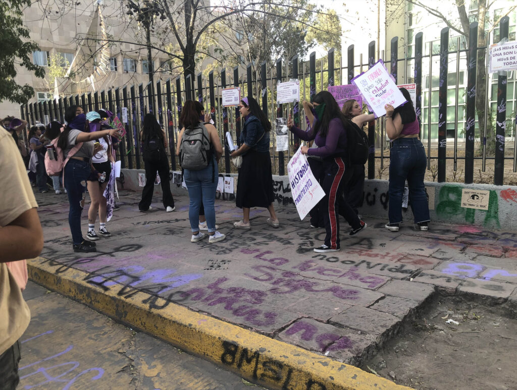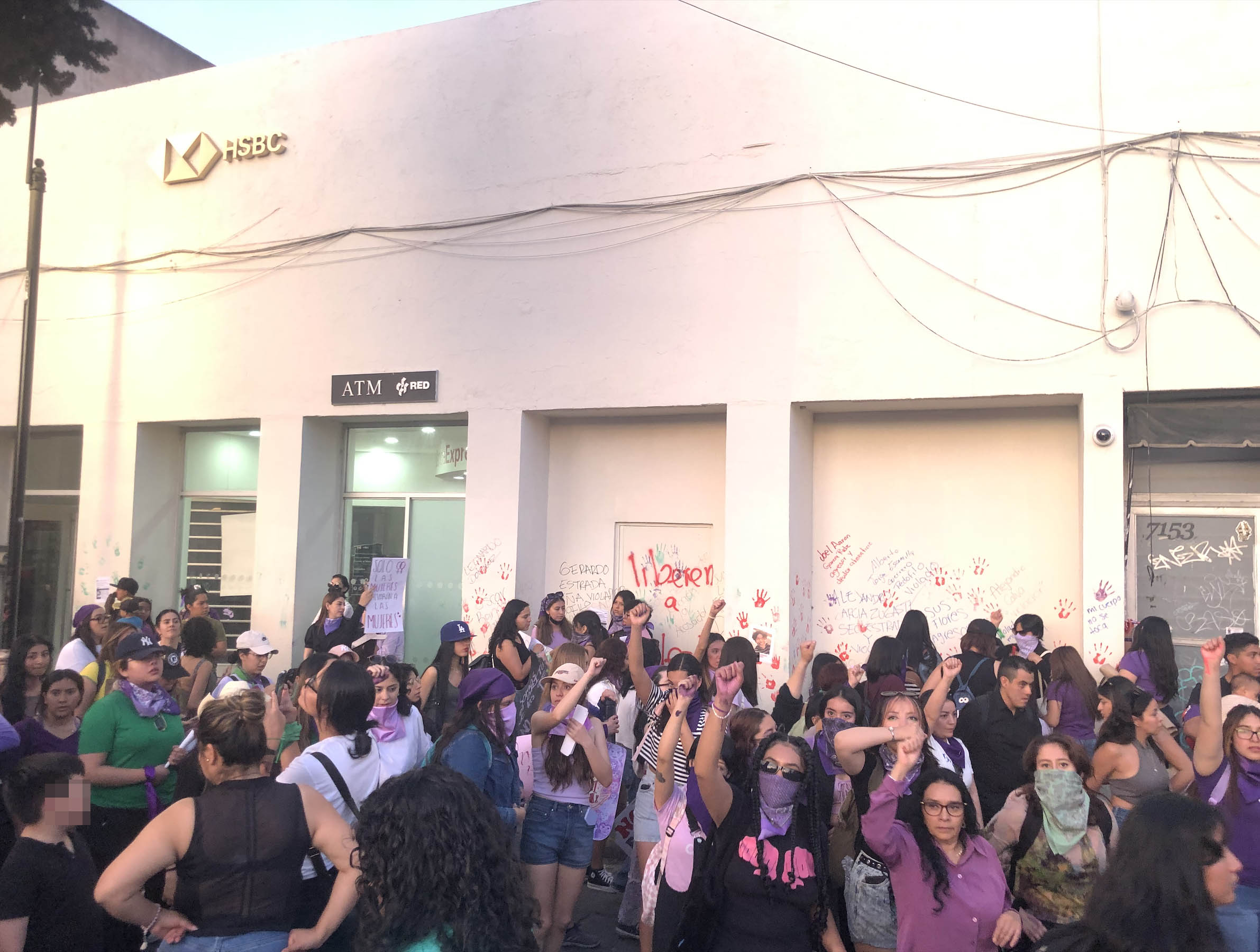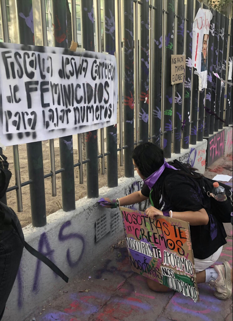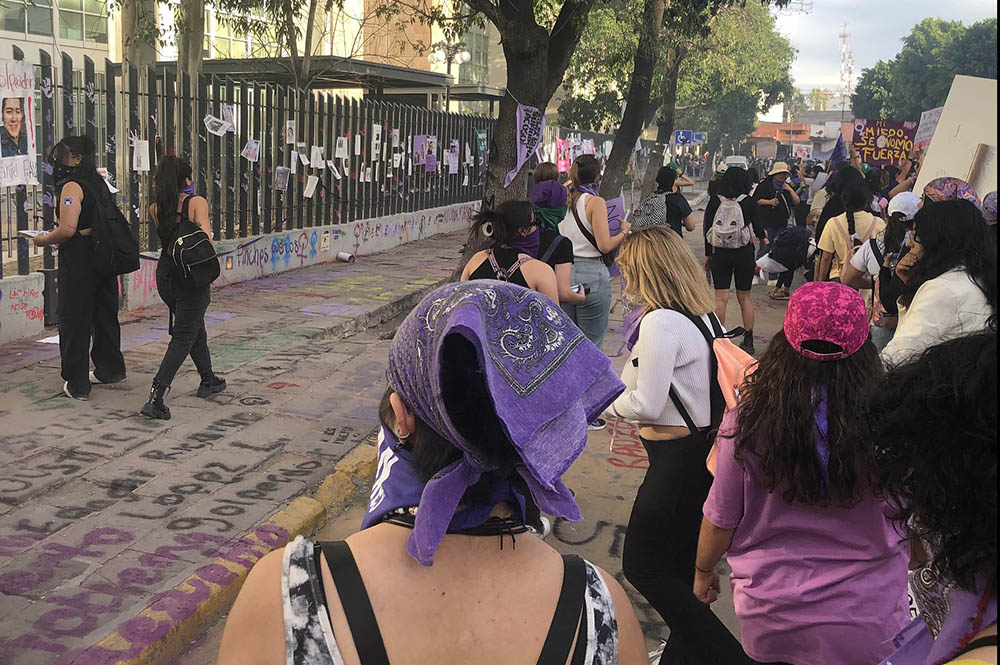 Frente a la Fiscalía General del Estado, el interminable contingente encabezado por familiares de víctimas, personas desaparecidas y grupos feministas se detuvo para honrar a quienes ya no están y para denunciar la falta de acción contra feminicidas, violadores y agresores de mujeres, todo ello, ante la mirada de varios elementos de la Guardia Civil Estatal que se encontraban en la azotea del Edificio de Seguridad Pública.