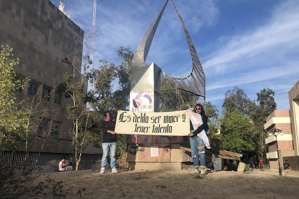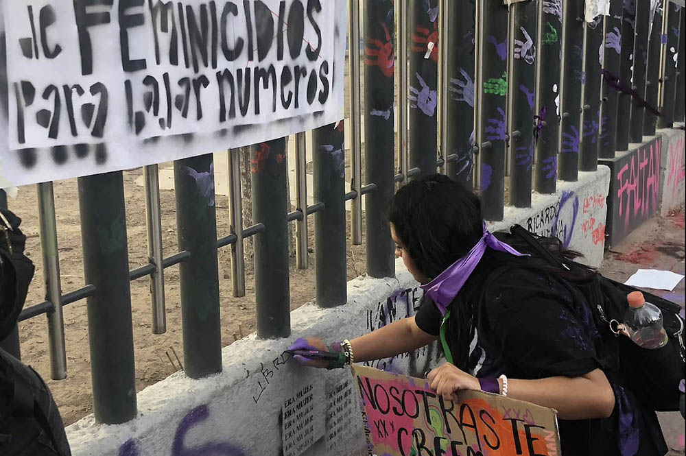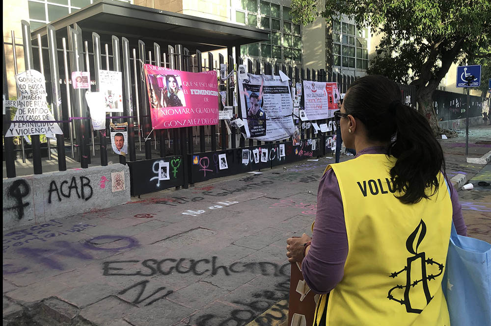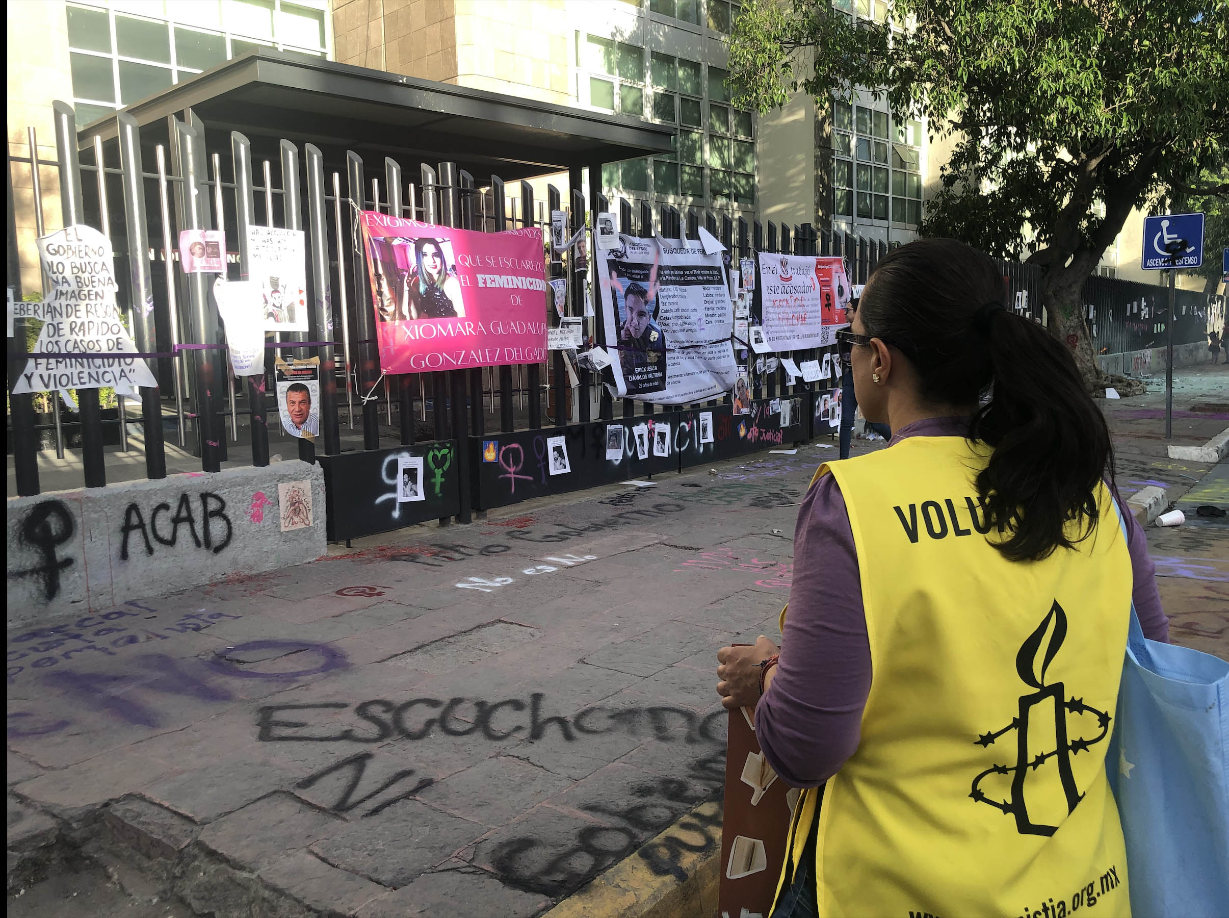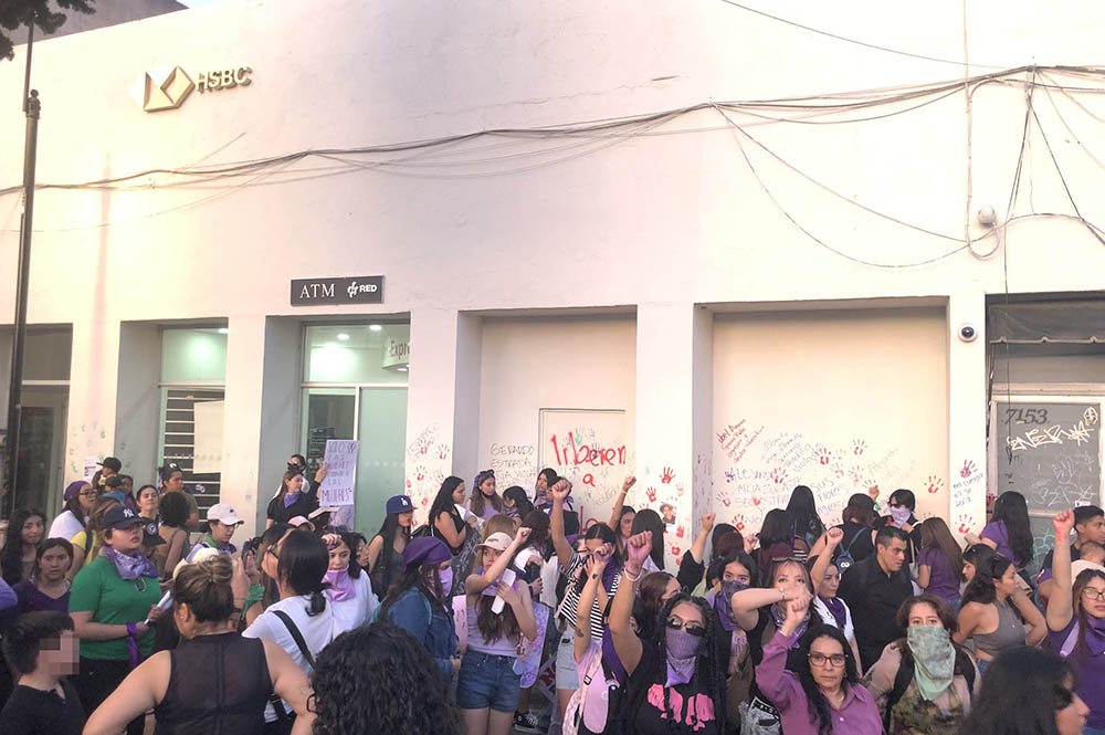 Frente a la Fiscalía General del Estado, el interminable contingente encabezado por familiares de víctimas, personas desaparecidas y grupos feministas se detuvo para honrar a quienes ya no están y para denunciar la falta de acción contra feminicidas, violadores y agresores de mujeres, todo ello, ante la mirada de varios elementos de la Guardia Civil Estatal que se encontraban en la azotea del Edificio de Seguridad Pública.