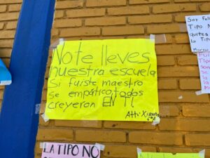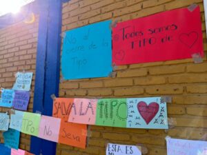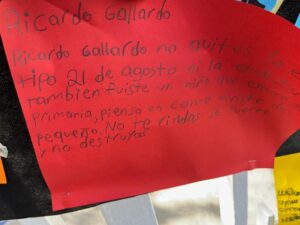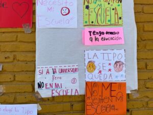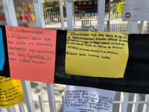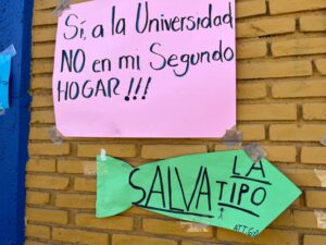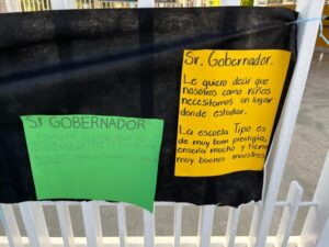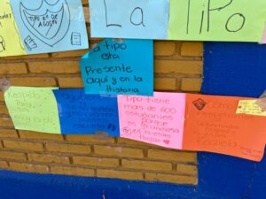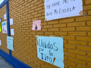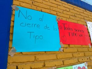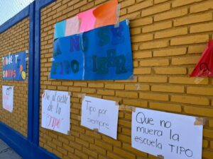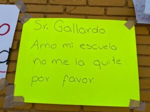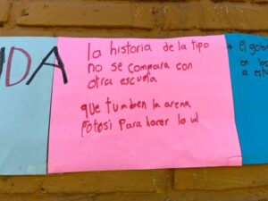 “No nos quiten la Tipo”, “Que tumben la Arena Potosí para hacer la uni”, “No me quiten mi escuela”, Sí a la uni pero no en mi escuela”, “Todos somos Tipo”, “Tipo tiene más de 600 estudiantes porque es grandiosa, es nuestro hogar”, “Mi escuela la queremos mucho”, “117 años siendo pilar de la educación”, “Sr. Gallardo, amo mi escuela, no me la quite por favor” y “Mi escuela no tiene fallas geológicas” son algunos de los mensajes pegados en la reja y barda de la primaria, donde también hay varias cartas dirigidas a Gallardo Cardona, en las que piden conservar la escuela.