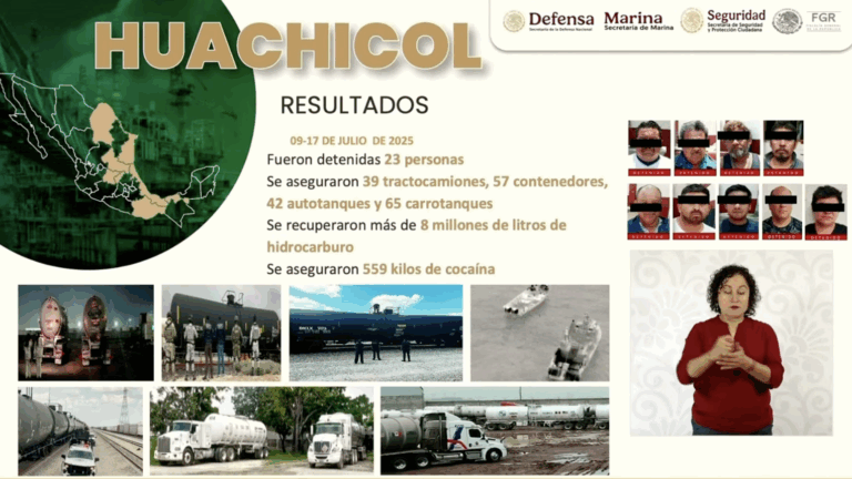 Añadió que en total fueron detenidas 23 personas; se aseguraron 39 tractocamiones, 57 contenedores, 42 autotanques y 65 carrotanques, y se logró la recuperación de más de 8 millones de litros de hidrocarburo.