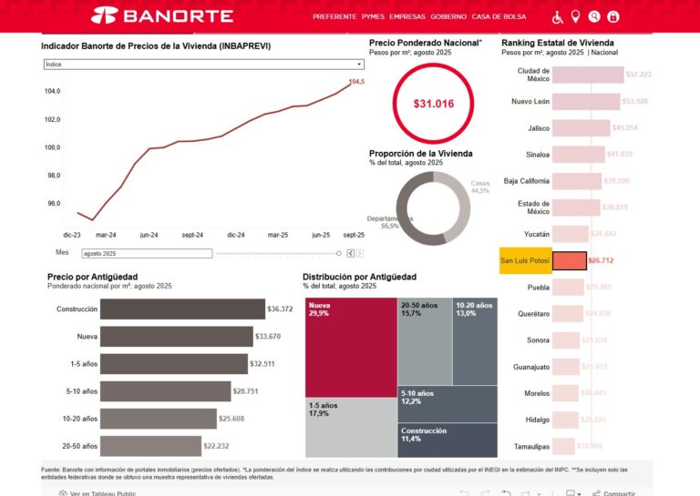 Durante agosto, el precio de la vivienda a nivel nacional registró una variación anual de 4 % y el promedio se ubicó en $31,016 pesos por metro cuadrado, un incremento de 0.6 % en comparación con el mes anterior, destacó el Indicador de Precios de Vivienda de Banorte (Inbaprevi).