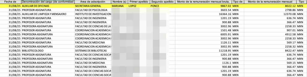 De acuerdo con información publicada en la Plataforma Estatal de Transparencia, Mariana López Ponce se desempeña como auxiliar de oficinas en la Secretaría General de la UASLP, misma que es encabezada por Federico Garza Herrera.