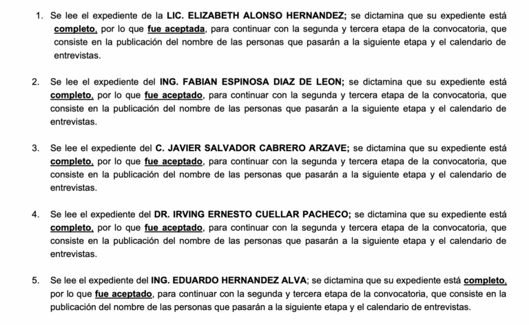 En el documento se detalla que el pasado 18 de noviembre, la Comisión de Selección del Sistema Estatal Anticorrupción de San Luis Potosí, llevó a cabo la primera etapa del proceso de selección, de manera personal consistente en una evaluación documental que permita determinar el cumplimiento de los requisitos que establece la Ley del Sistema Estatal Anticorrupción de San Luis Potosí y los señalados en la convocatoria.