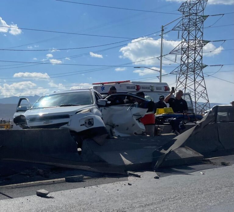El accidente se registró alrededor de las 12:30 horas, cuando un camión tipo revolvedora que circulaba por el Periférico descendía del puente con dirección a la avenida Industrias. En ese punto, el vehículo pesado impactó de costado a una camioneta Chevrolet, color blanco, la cual fue proyectada contra el muro de contención.