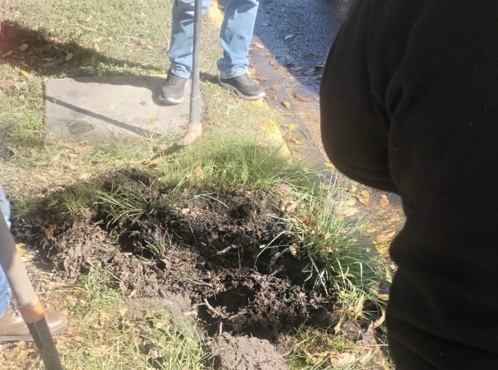 Técnicos del Organismo Operador de Agua, Alcantarillado y Saneamiento, revisan lo que parece ser una posible toma clandestina ubicada en la avenida Mariano Jiménez en un camellón, tras detectarse una fuga de agua potable.
