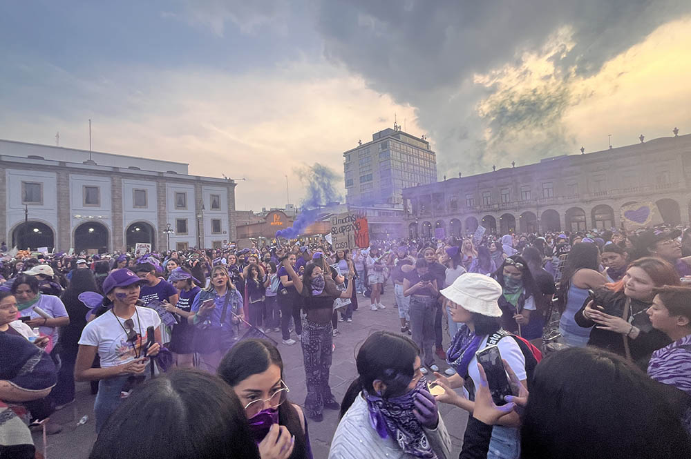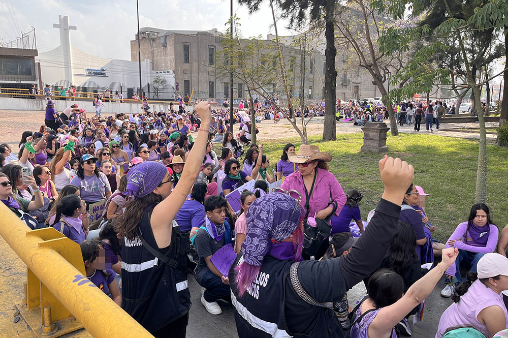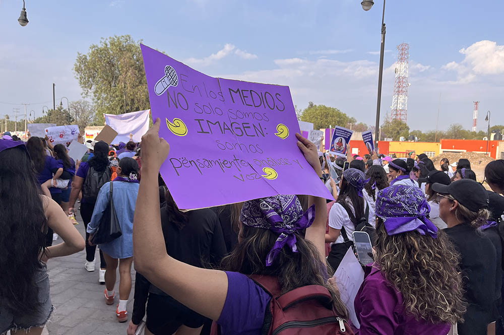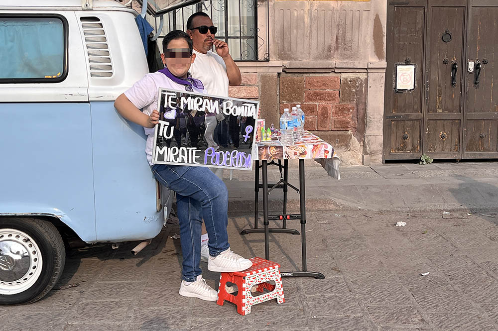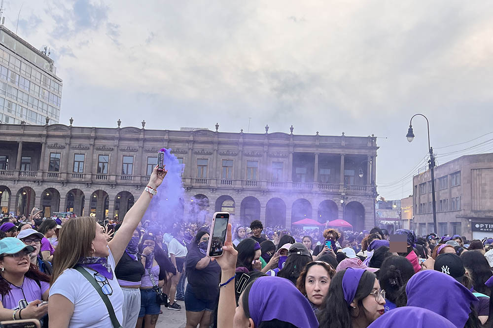 Sobre la calle Chicosein, un menor de edad, con una sonrisa que transmitía una enorme empatía, invitaba sin necesidad de una sola palabra a las mujeres que pasaban frente a él a mirarse en un espejo, en el que se podía leer: “Te miran bonita, tú mírate poderosa”. En contraste, hubo quienes desde una vivienda ubicada en Eje Vial, arrojaron piedras a la enorme columna de mujeres, la mayoría de ellas ataviadas con prendas moradas.