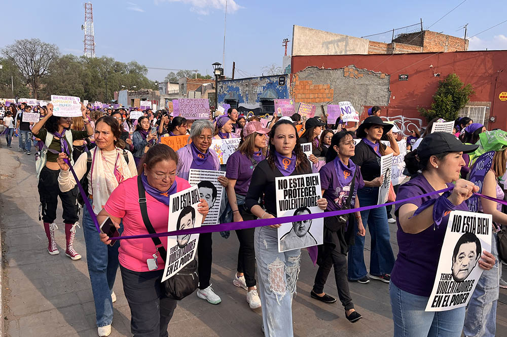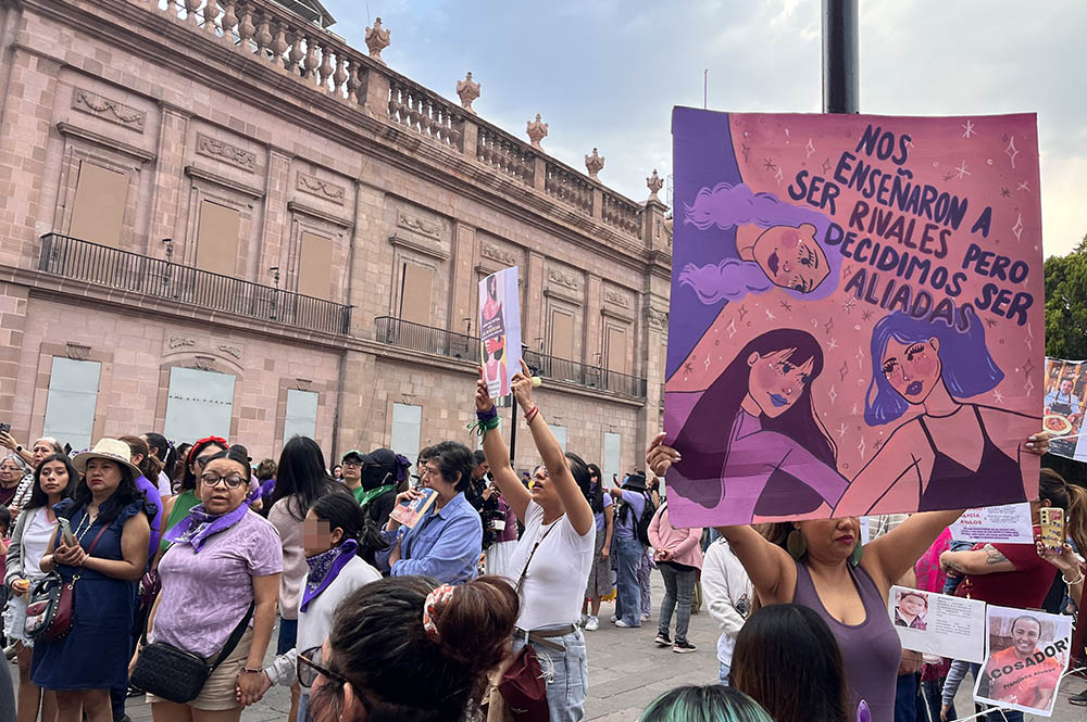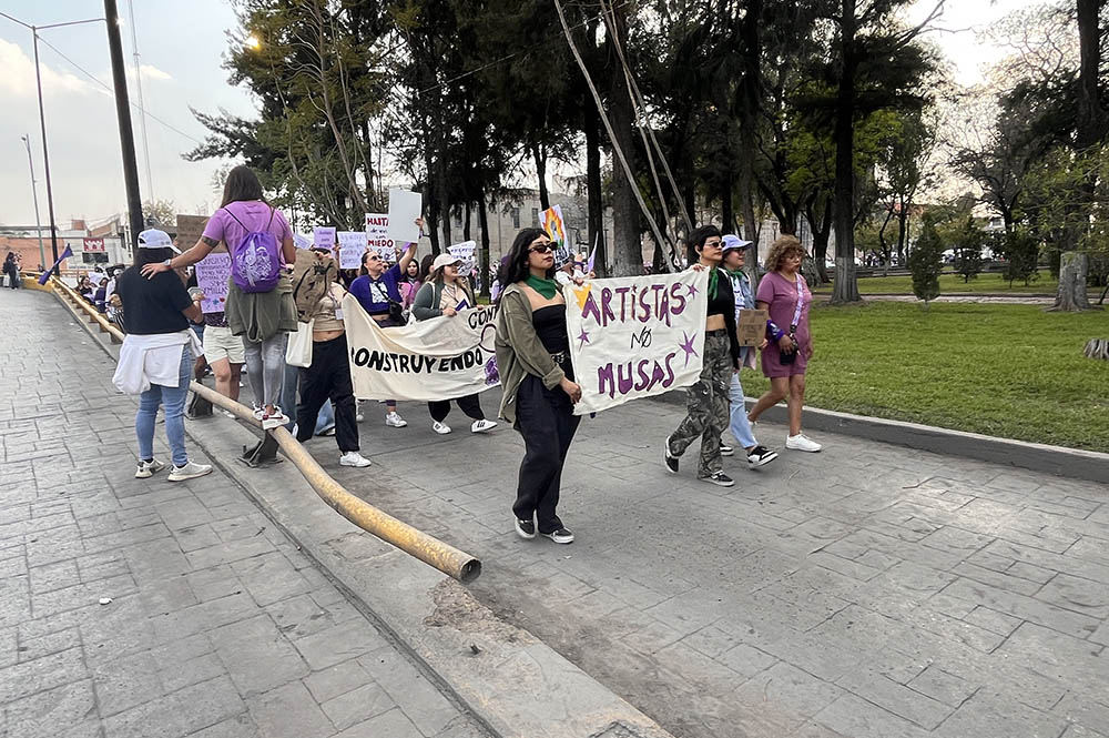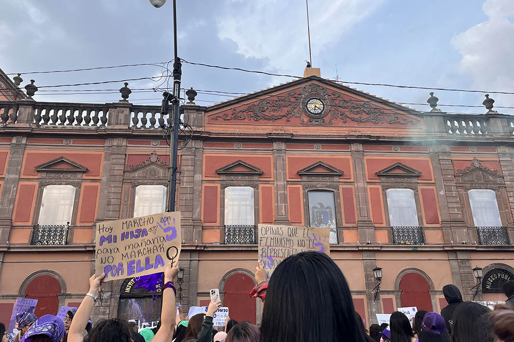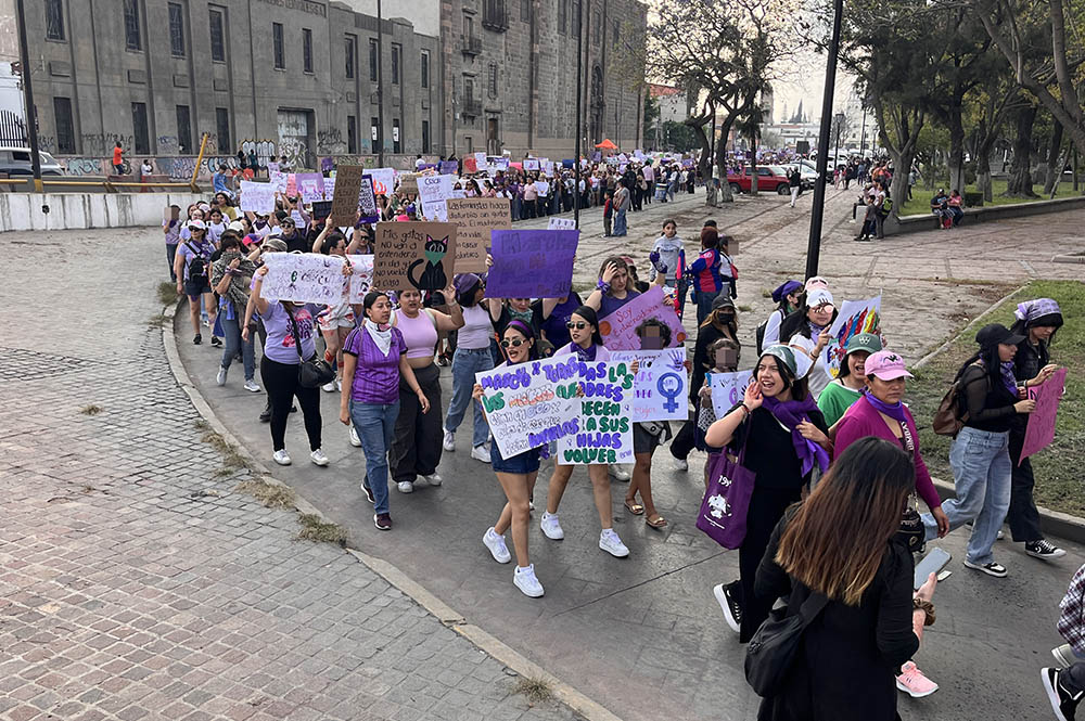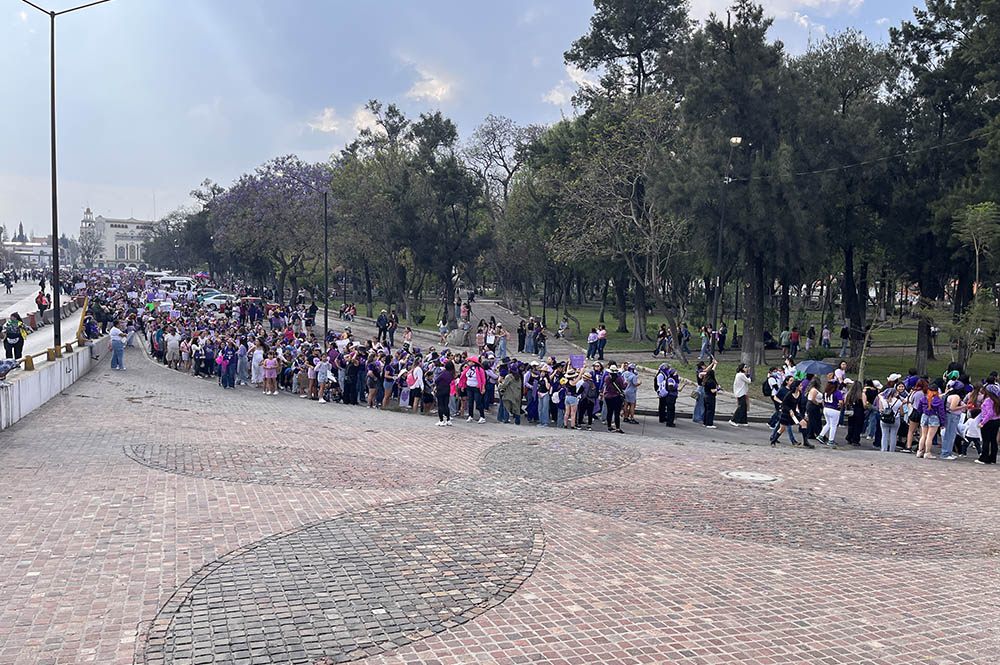 Sobre la calle Chicosein, un menor de edad, con una sonrisa que transmitía una enorme empatía, invitaba sin necesidad de una sola palabra a las mujeres que pasaban frente a él a mirarse en un espejo, en el que se podía leer: “Te miran bonita, tú mírate poderosa”. En contraste, hubo quienes desde una vivienda ubicada en Eje Vial, arrojaron piedras a la enorme columna de mujeres, la mayoría de ellas ataviadas con prendas moradas.