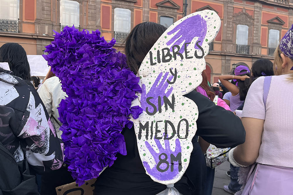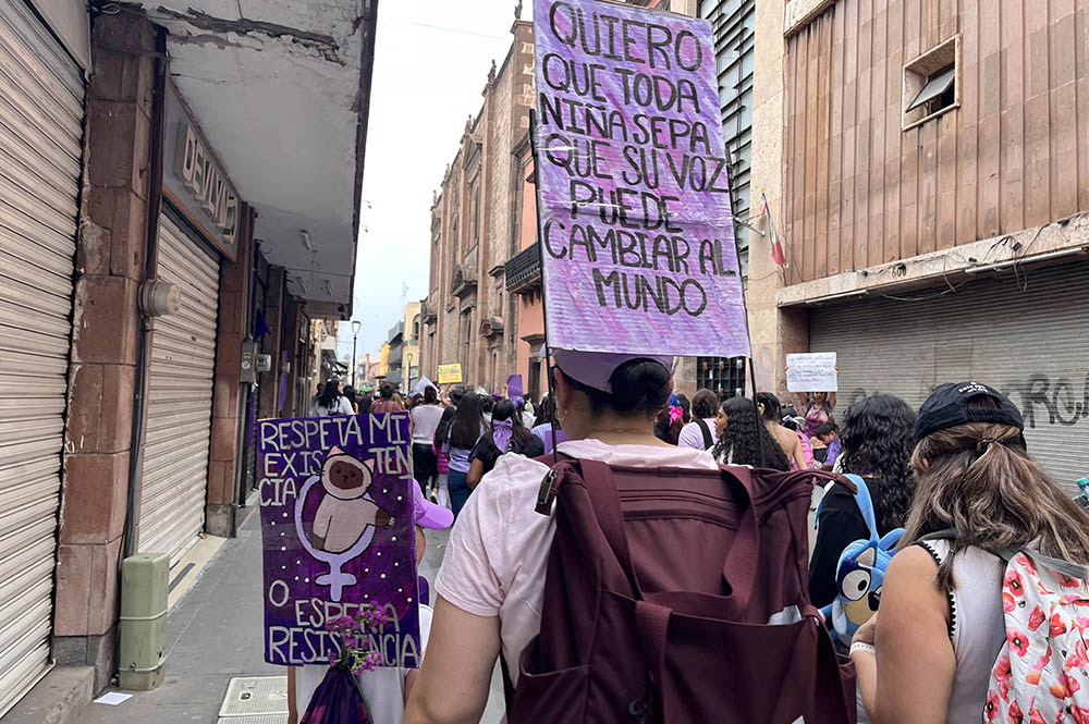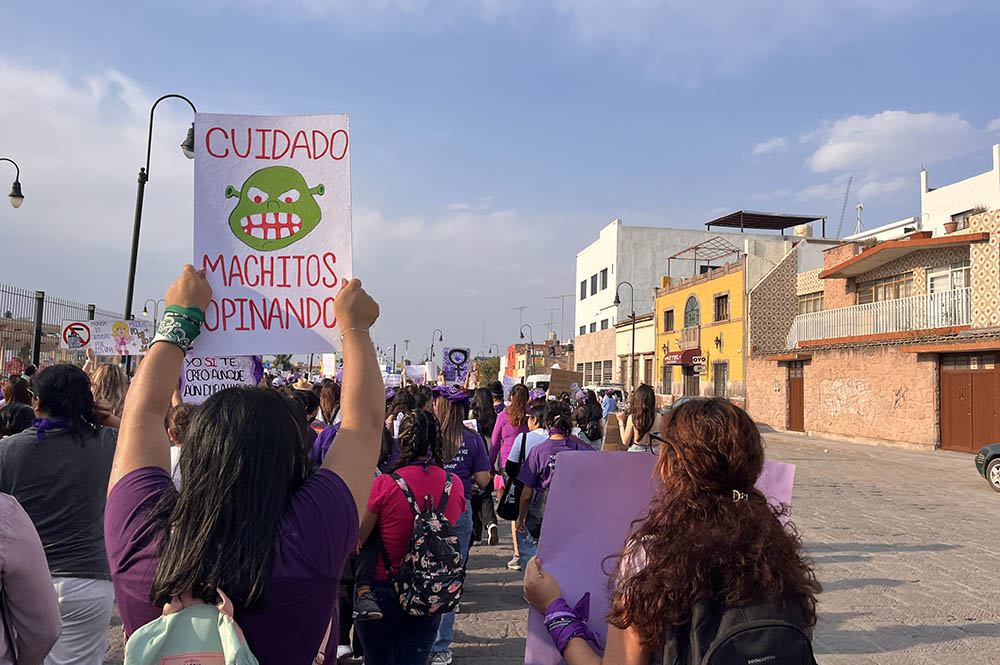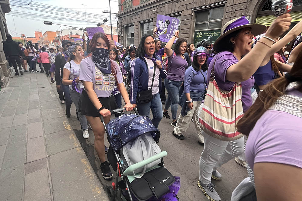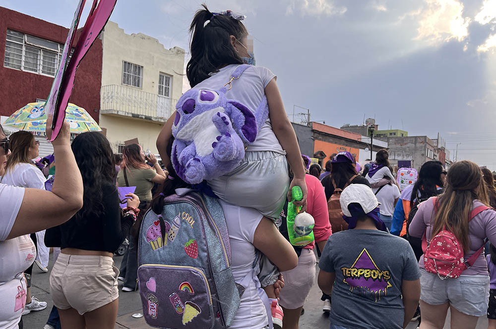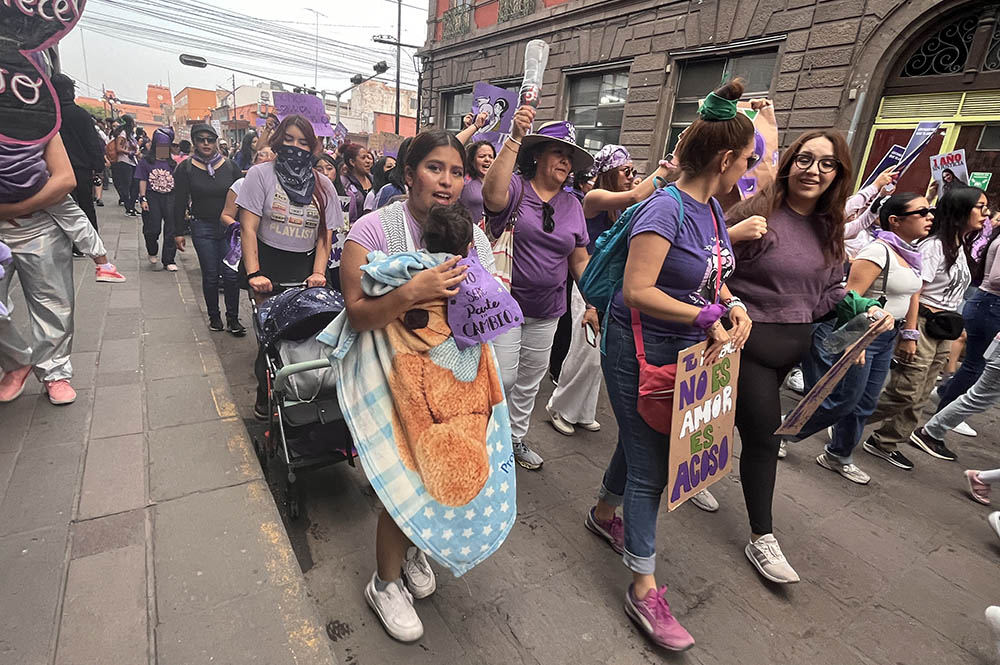 “Yo seré parte del cambio”, se leía en una hoja morada tamaño carta que portaba a modo de capita un bebé envuelto en una frazada azul decorada con un enorme oso. El menor de edad recorrió las calles del Centro Histórico de la capital potosina en los brazos de su mamá, quien a cada paso coreó las consignas de la marcha del 8M.