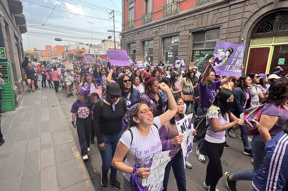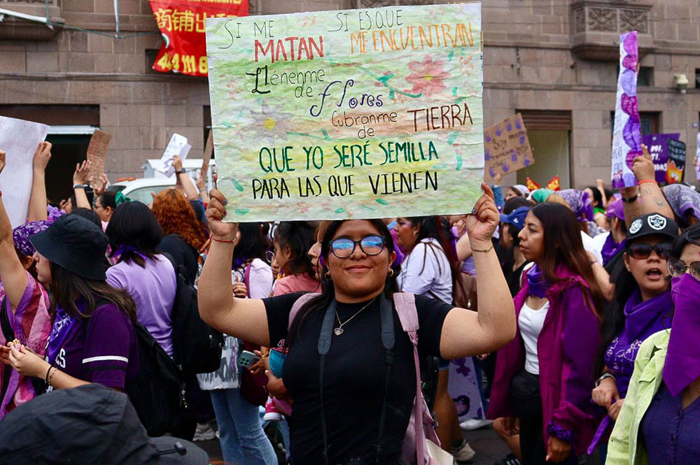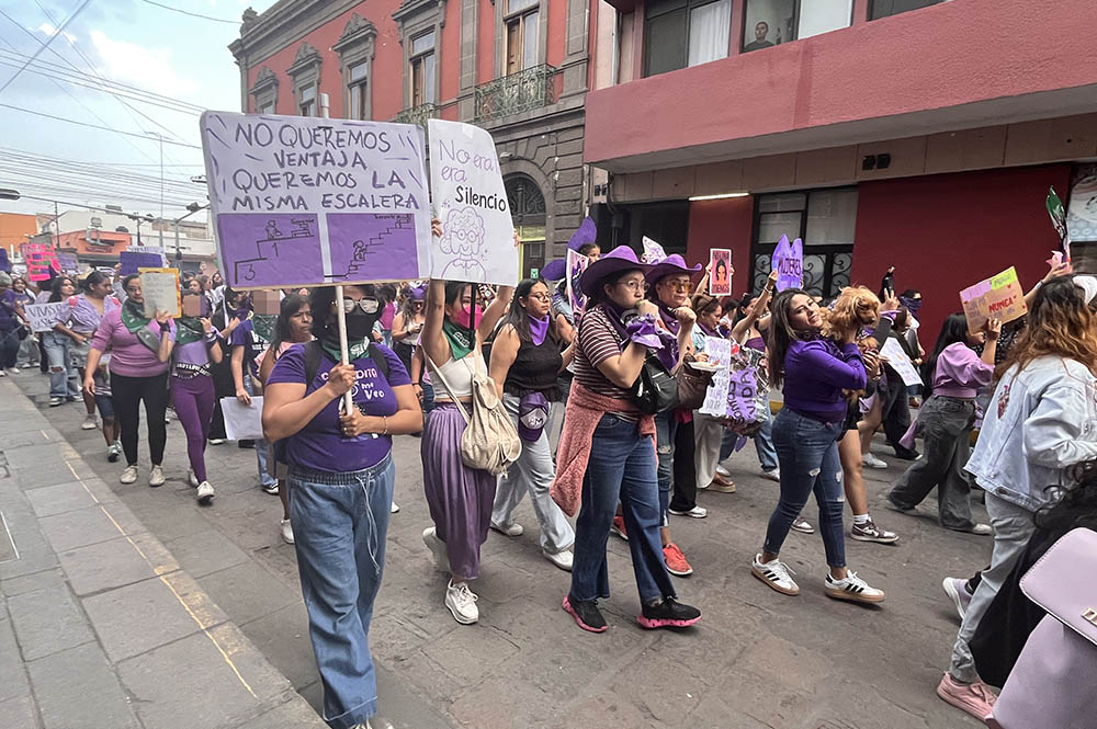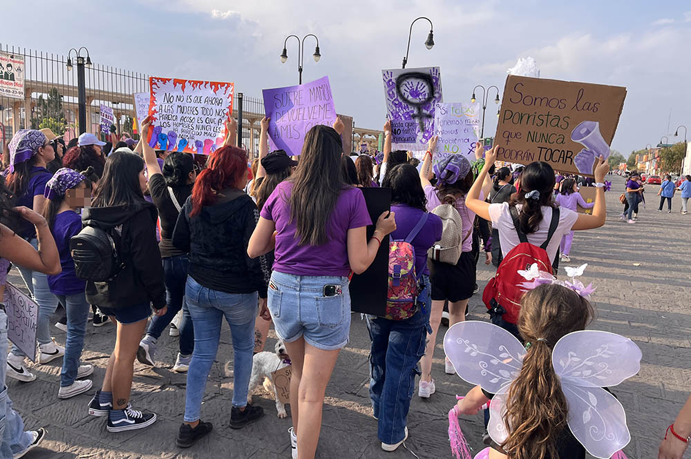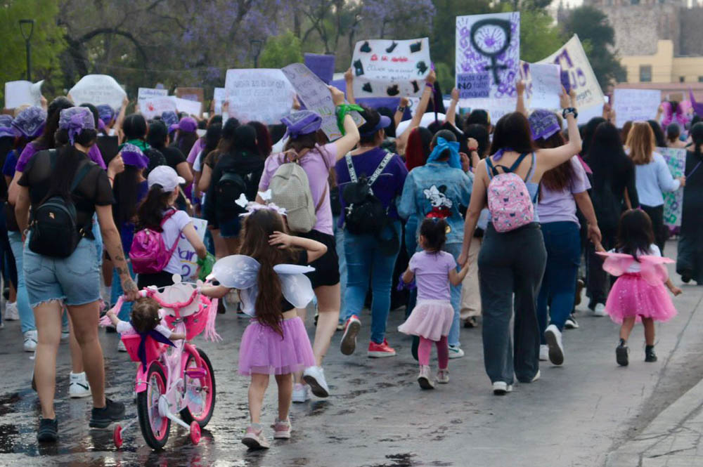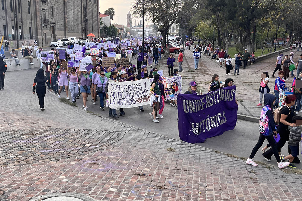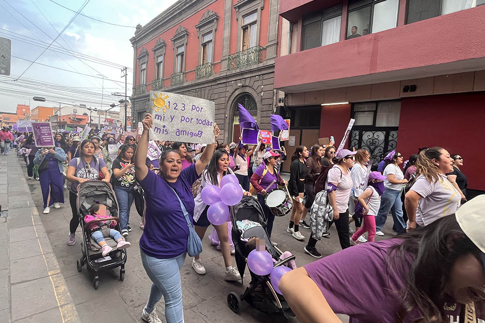 “Yo seré parte del cambio”, se leía en una hoja morada tamaño carta que portaba a modo de capita un bebé envuelto en una frazada azul decorada con un enorme oso. El menor de edad recorrió las calles del Centro Histórico de la capital potosina en los brazos de su mamá, quien a cada paso coreó las consignas de la marcha del 8M.