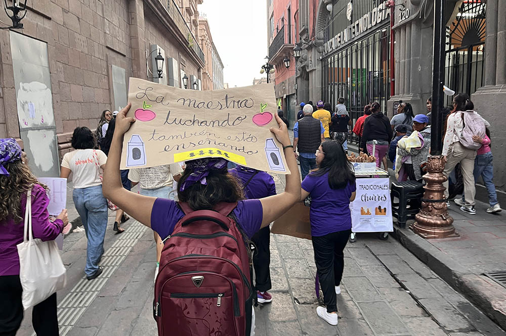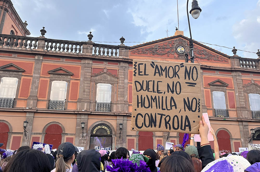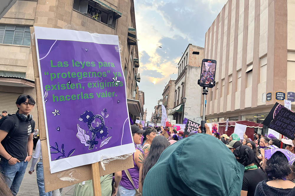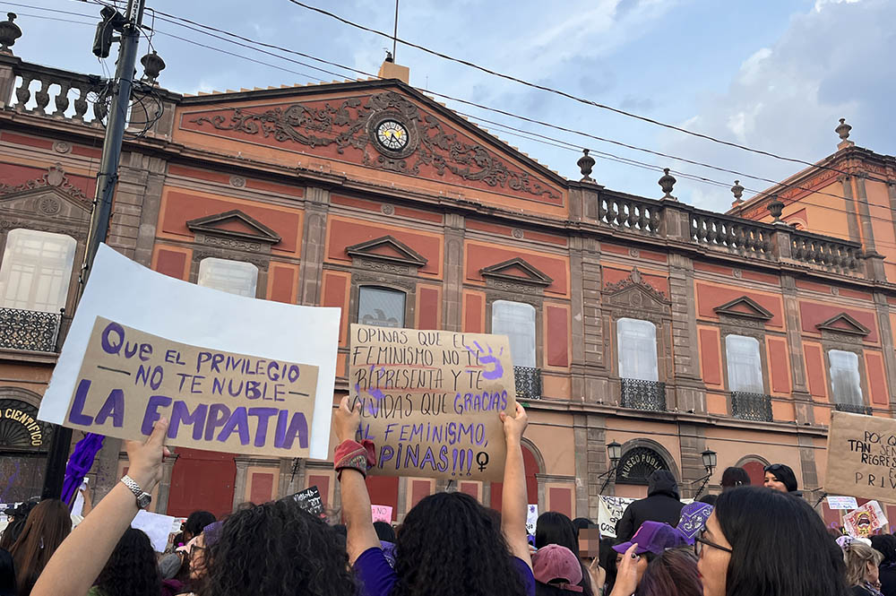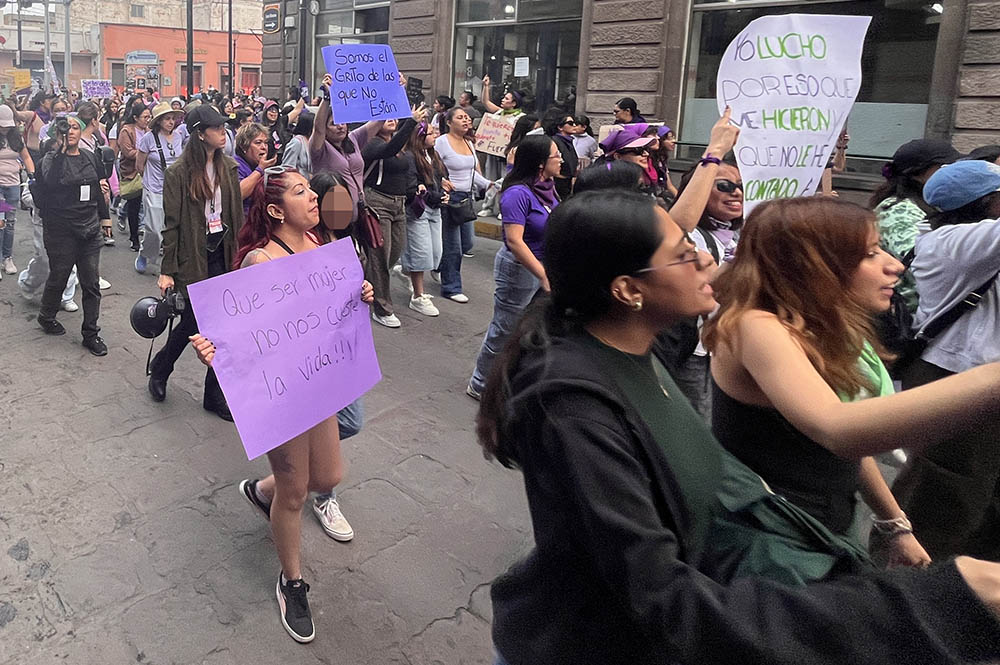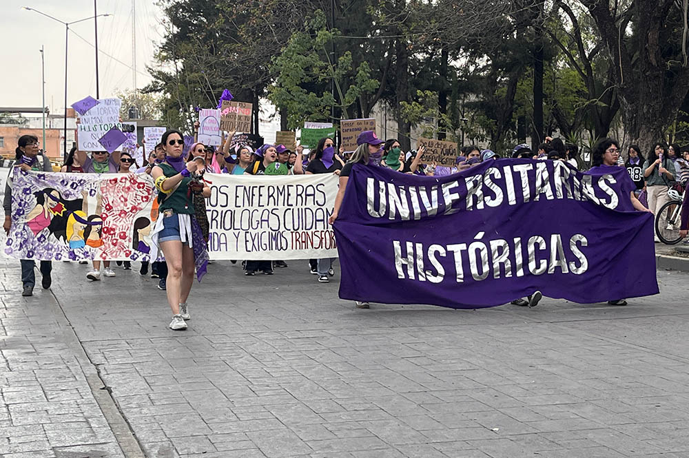 “Yo seré parte del cambio”, se leía en una hoja morada tamaño carta que portaba a modo de capita un bebé envuelto en una frazada azul decorada con un enorme oso. El menor de edad recorrió las calles del Centro Histórico de la capital potosina en los brazos de su mamá, quien a cada paso coreó las consignas de la marcha del 8M.