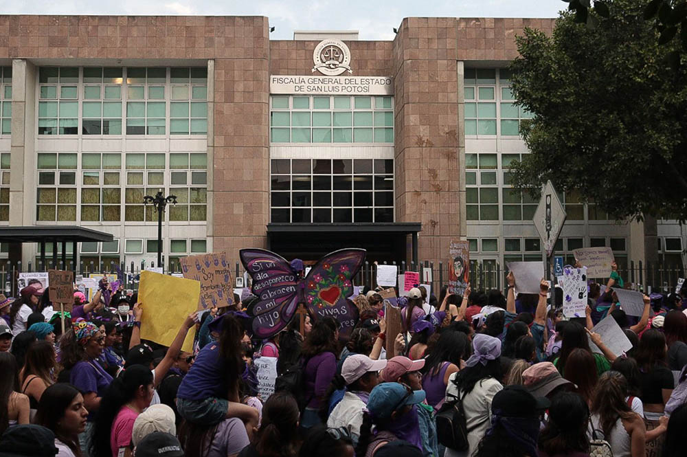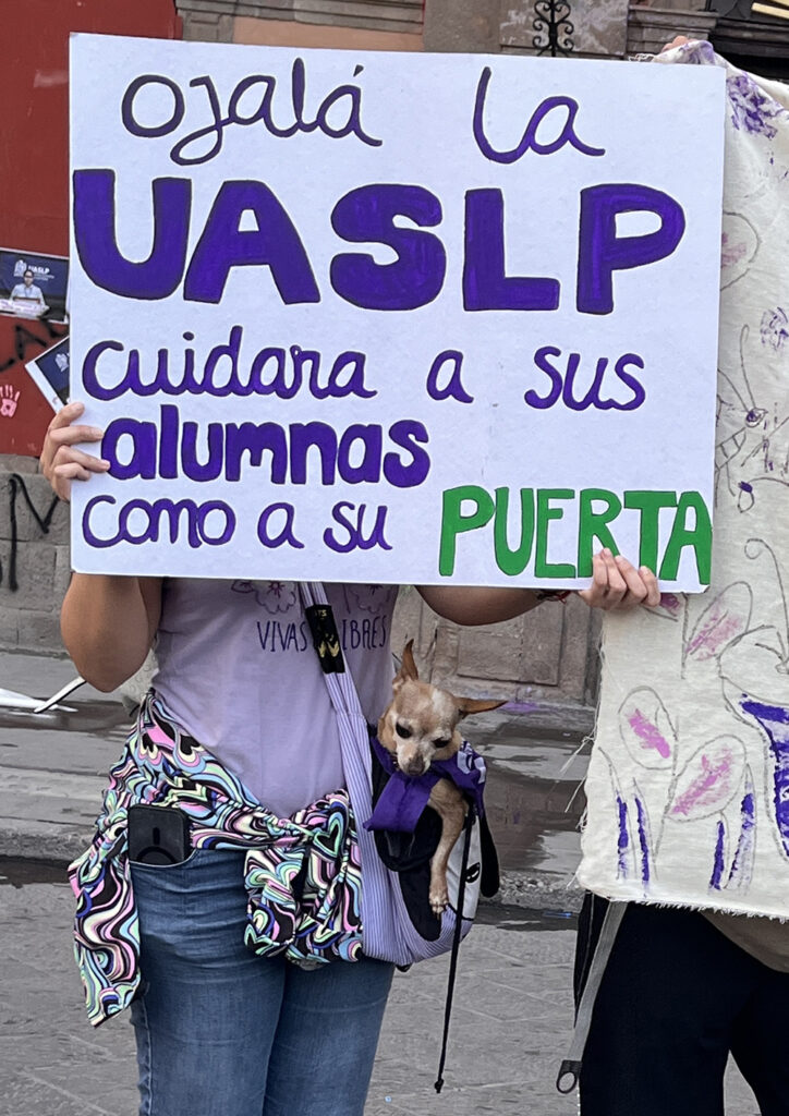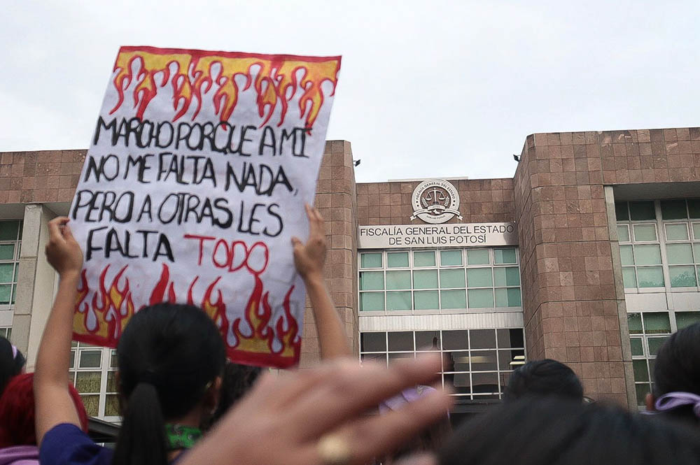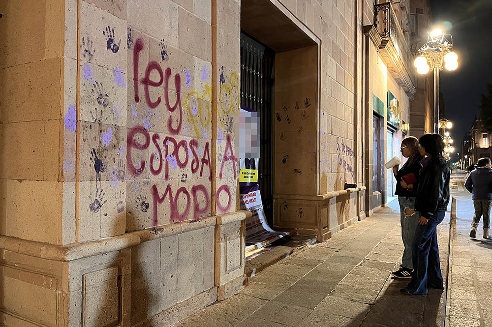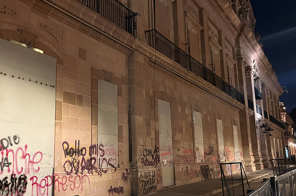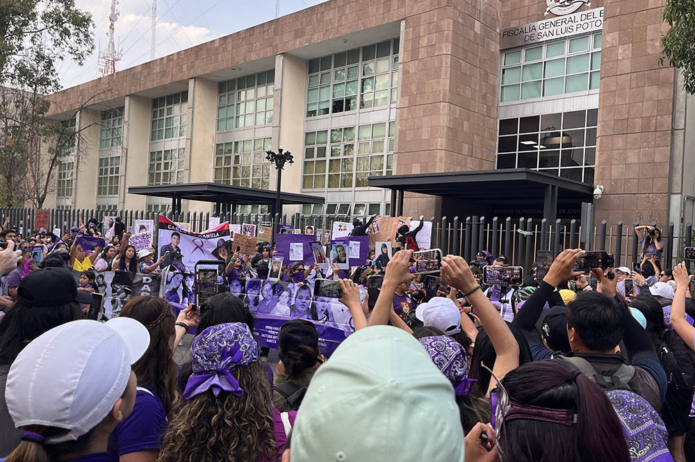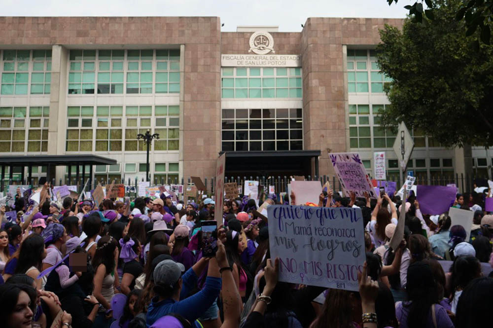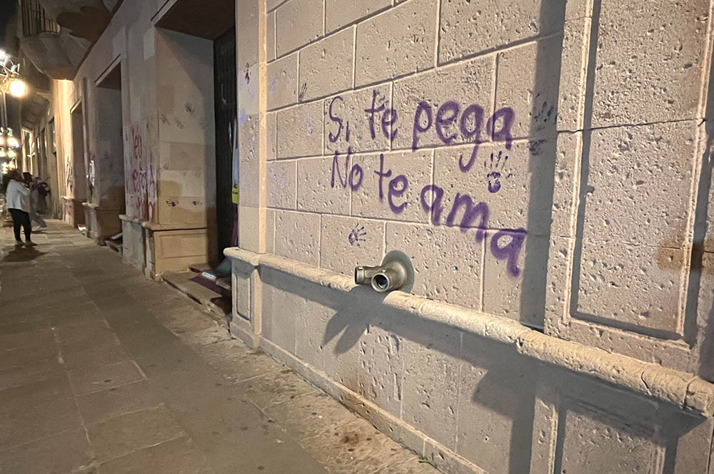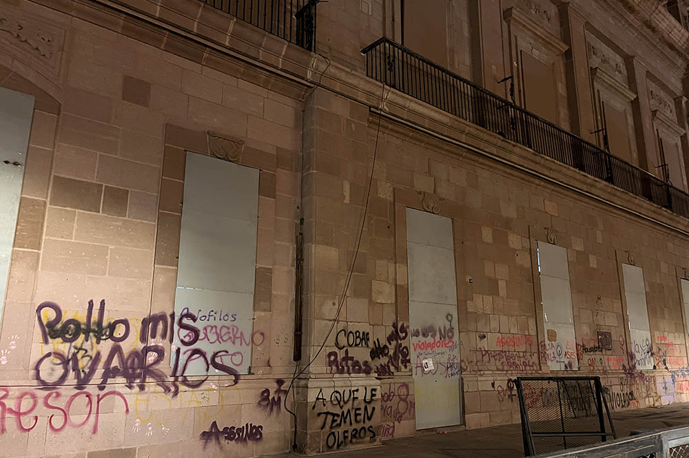 También en las bardas del Congreso del Estado, el Palacio de Gobierno y la Universidad Autónoma de San Luis Potosí, así como en las fachadas de algunos negocios quedaron las pintas y evidencias del paso de la marcha, además de mensajes como: “Ley esposa a modo”, “No está bien tener violentadores en el poder”, “Ojalá la UASLP cuidara a sus alumnas como a su puerta”, “La violencia no se ejerce, también se legisla”. Los vidrios y puertas fueron blindados desde días antes para evitar daños. Aun así, las pancartas que miles portaron durante la movilización, fueron recolectadas para que ardieran frente a las puertas del Edificio Central.