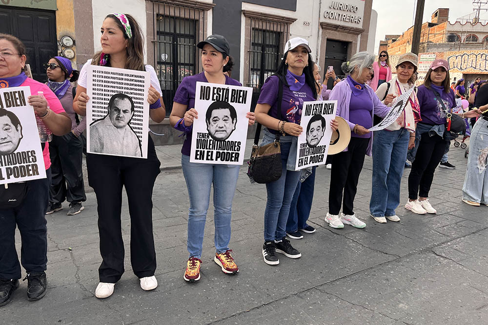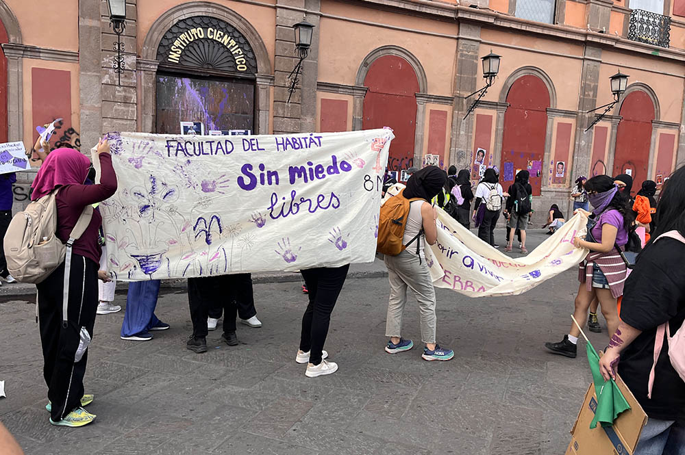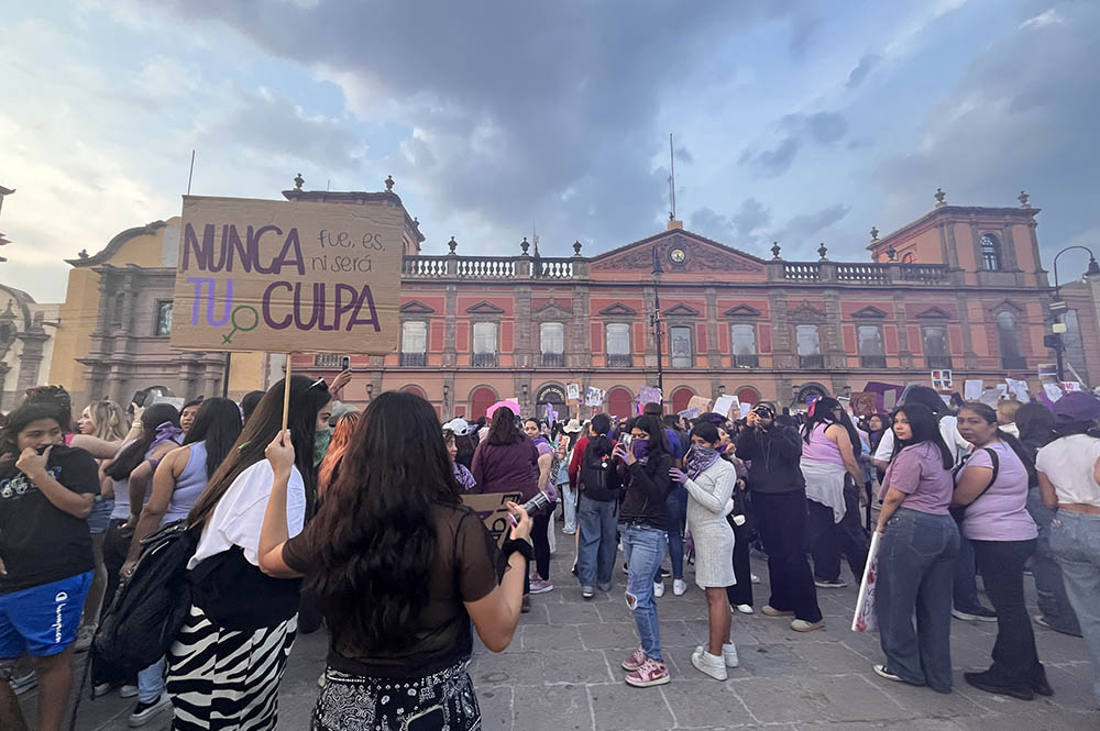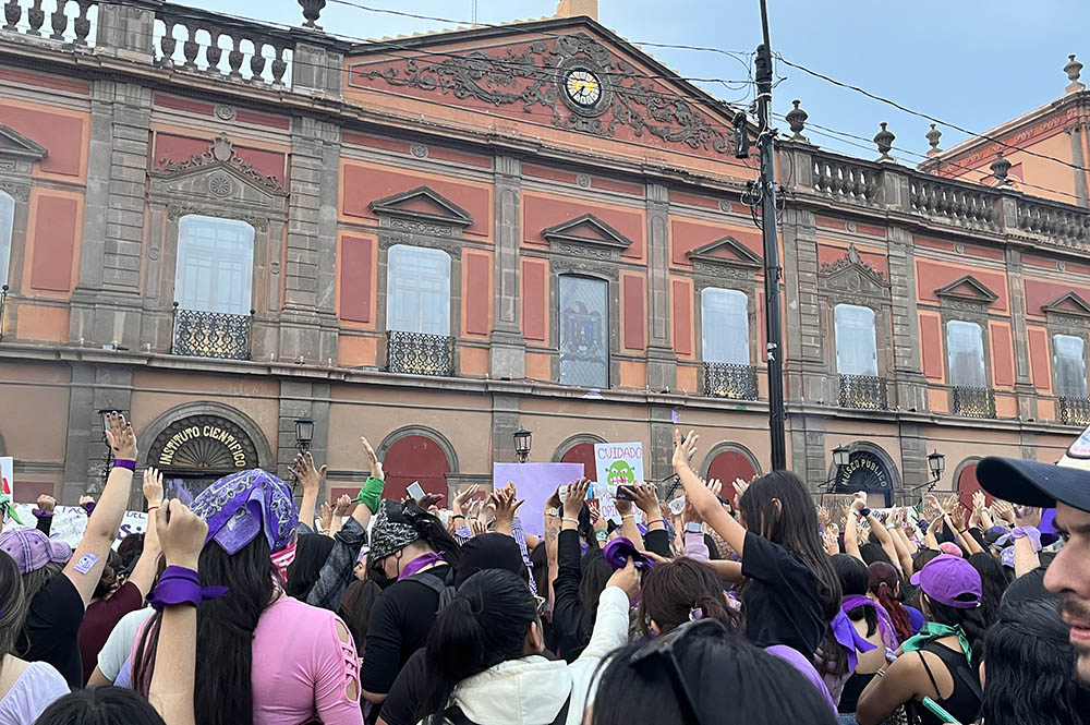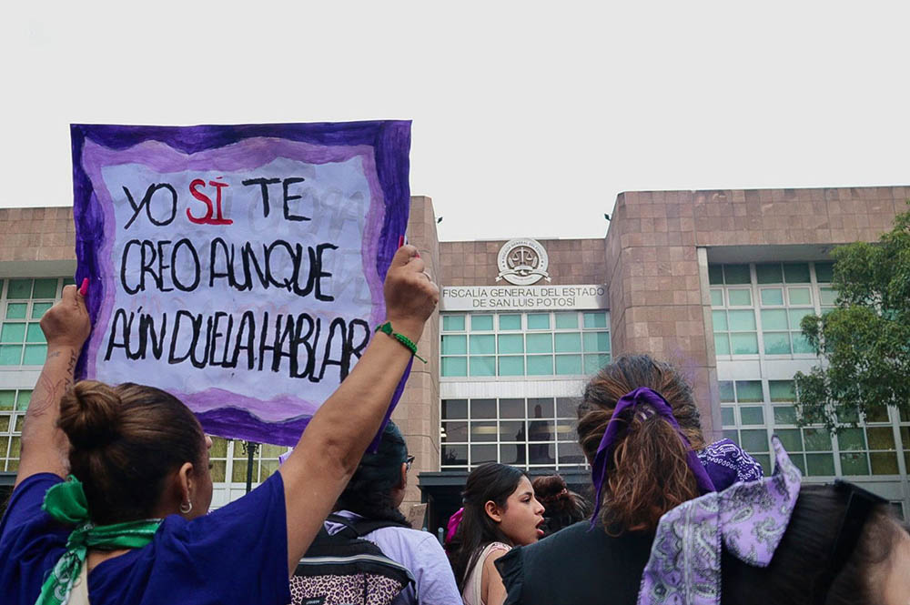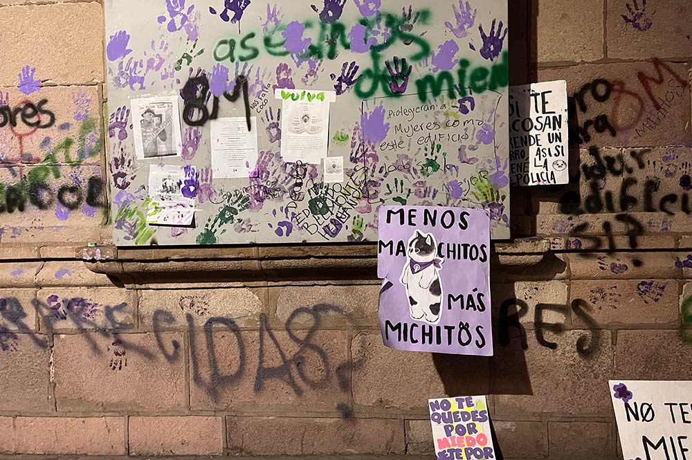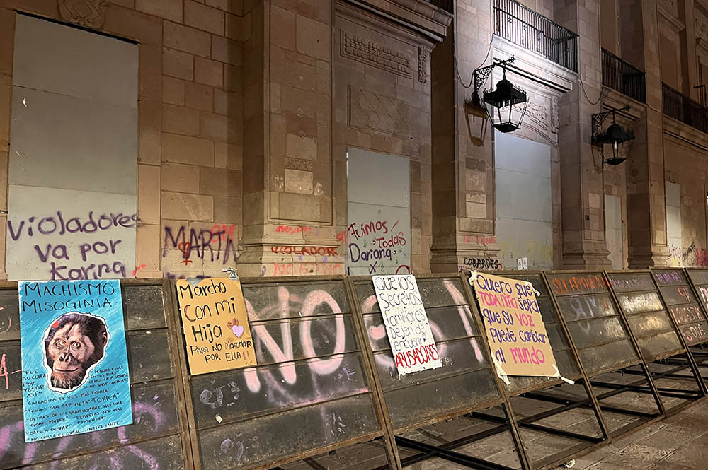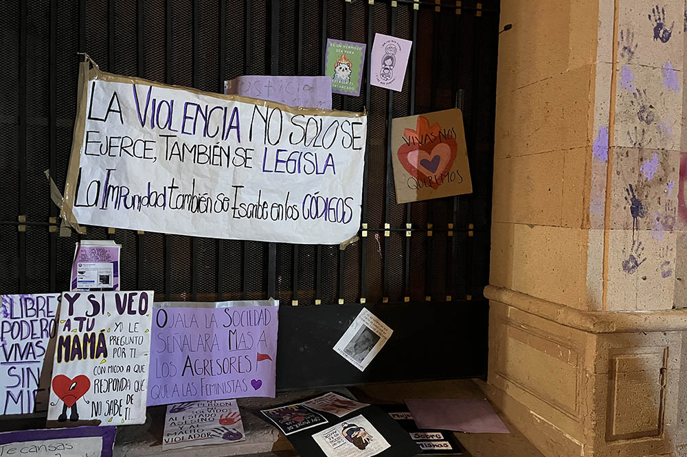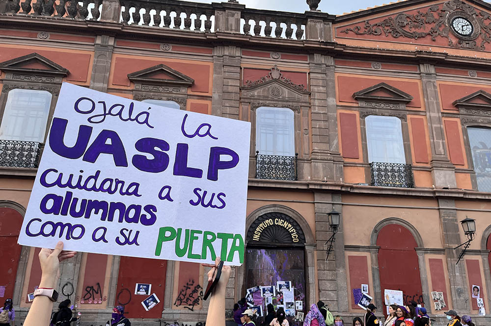 También en las bardas del Congreso del Estado, el Palacio de Gobierno y la Universidad Autónoma de San Luis Potosí, así como en las fachadas de algunos negocios quedaron las pintas y evidencias del paso de la marcha, además de mensajes como: “Ley esposa a modo”, “No está bien tener violentadores en el poder”, “Ojalá la UASLP cuidara a sus alumnas como a su puerta”, “La violencia no se ejerce, también se legisla”. Los vidrios y puertas fueron blindados desde días antes para evitar daños. Aun así, las pancartas que miles portaron durante la movilización, fueron recolectadas para que ardieran frente a las puertas del Edificio Central.