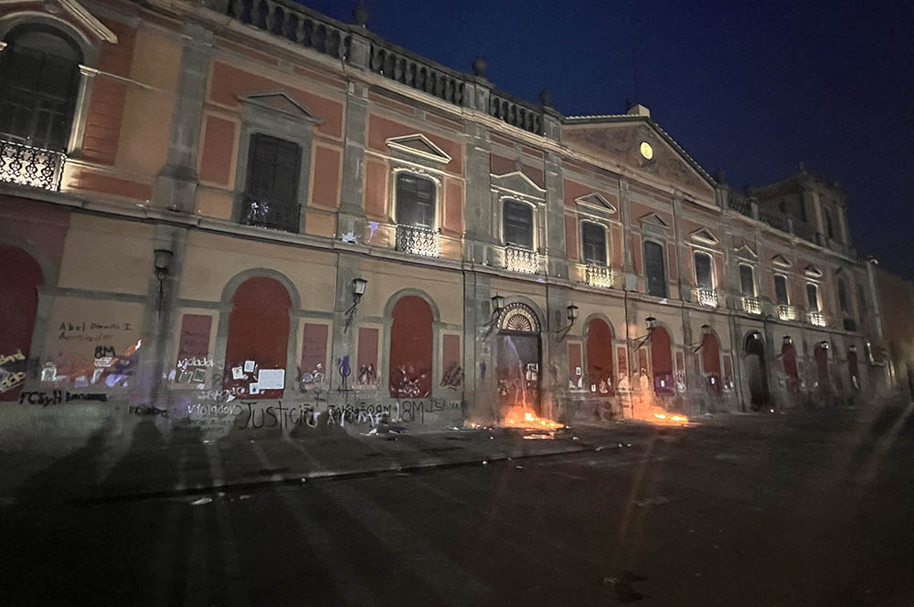 El recinto que se llevó la peor parte fue el templo de La Compañía. Mientras el grueso de la marcha se diluía, personas vestidas de negro y con el rostro cubierto destrozaron una cruz de cantera y quemaron la puerta de madera, además de romper unos vidrios y plasmar leyendas con aerosol. En respuesta, esta mañana se realizó sobre la plancha de Fundadores una misa de desagravio.